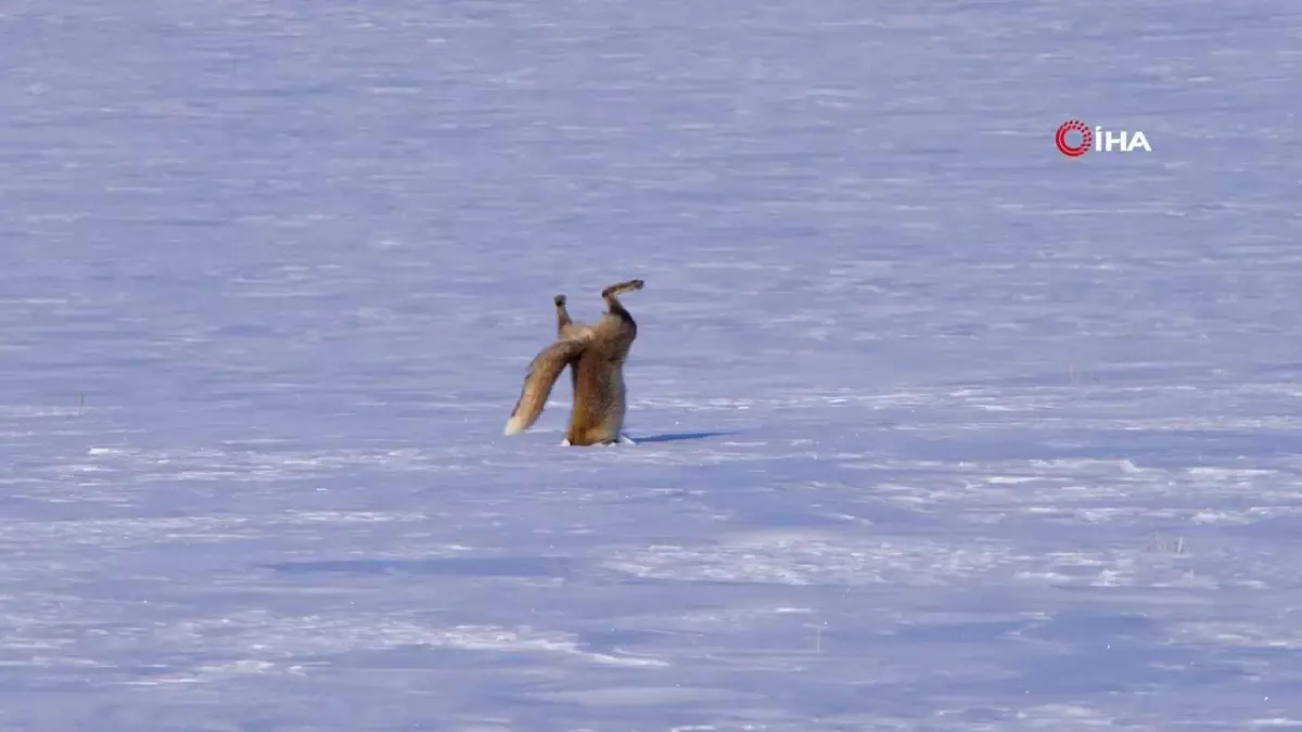 KARS - Ağır kış şartları nedeniyle aç kalan bir kızıl tilkinin, Kars'ta karlı arazide fare avı görüntülendi.