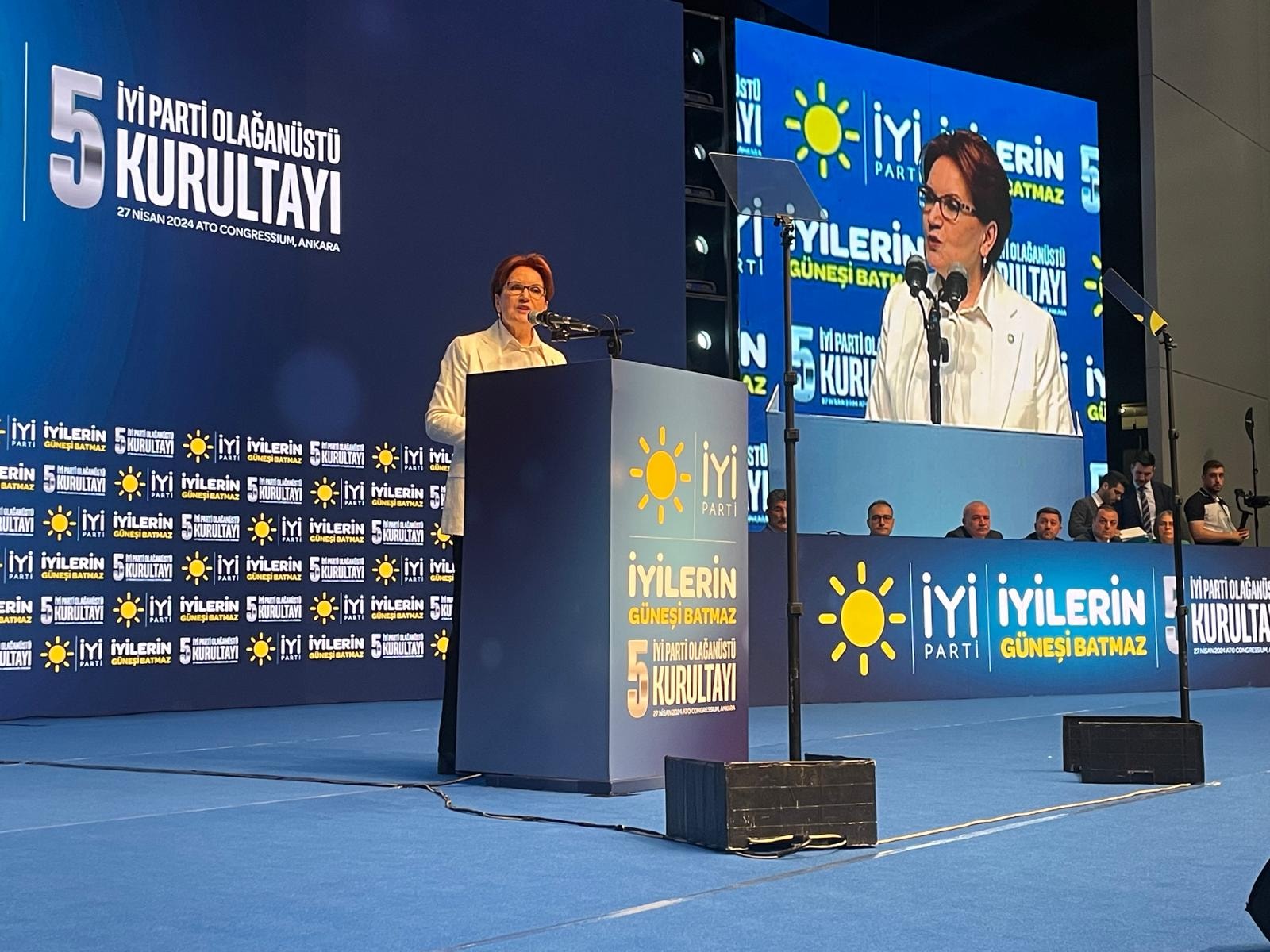 Salonda kurulan platformdaki dev ekrandan “İyilerin güneşi batmaz” sloganı ile Türk bayrağı ve Büyük Önder Mustafa Kemal Atatürk ile Akşener’in fotoğrafı yansıtıldı.