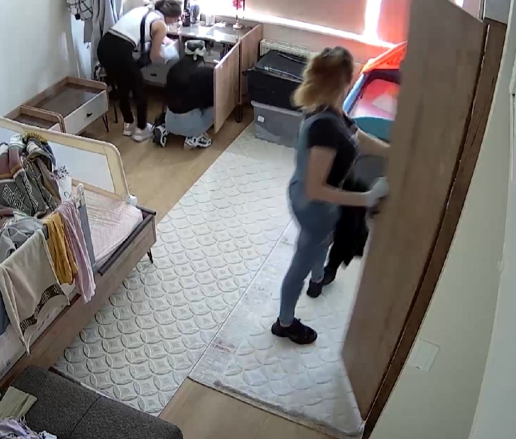 Hırsızlık anları, Aktaş aileinin iki bebeği için evlerine taktırdıkları güvenlik kameralarına yansıdı. Görüntülerde, kapıyı zorlayarak açtıktan sonra sakin tavırlarla eve giren 3 kadın şüpheli, doğrudan çiftin yatak odasına yöneliyor. Bu sırada 4’üncü şüphelinin kapıda beklediği görülüyor. Ellerine eldiven taktıkları görülen şüphelilerden ikisi şifonyeri ararken diğeri ise gardroba bakıyor. Şüpheliler ziynet eşyalarını aldıktan sonra yatak odasındaki güvenlik kamerasını fark ediyor. Yüzlerini kapatarak yatak odasından çıkan şüphelilerden biri, çocuk odasına girerek dolapların içine bakıyor. Sakin hareketleriyle dikkat çeken şüphelilerden birinin evden çıkarken salondaki güvenlik kamerasını fark ederek “Burada da mı var” dediği duyuluyor.