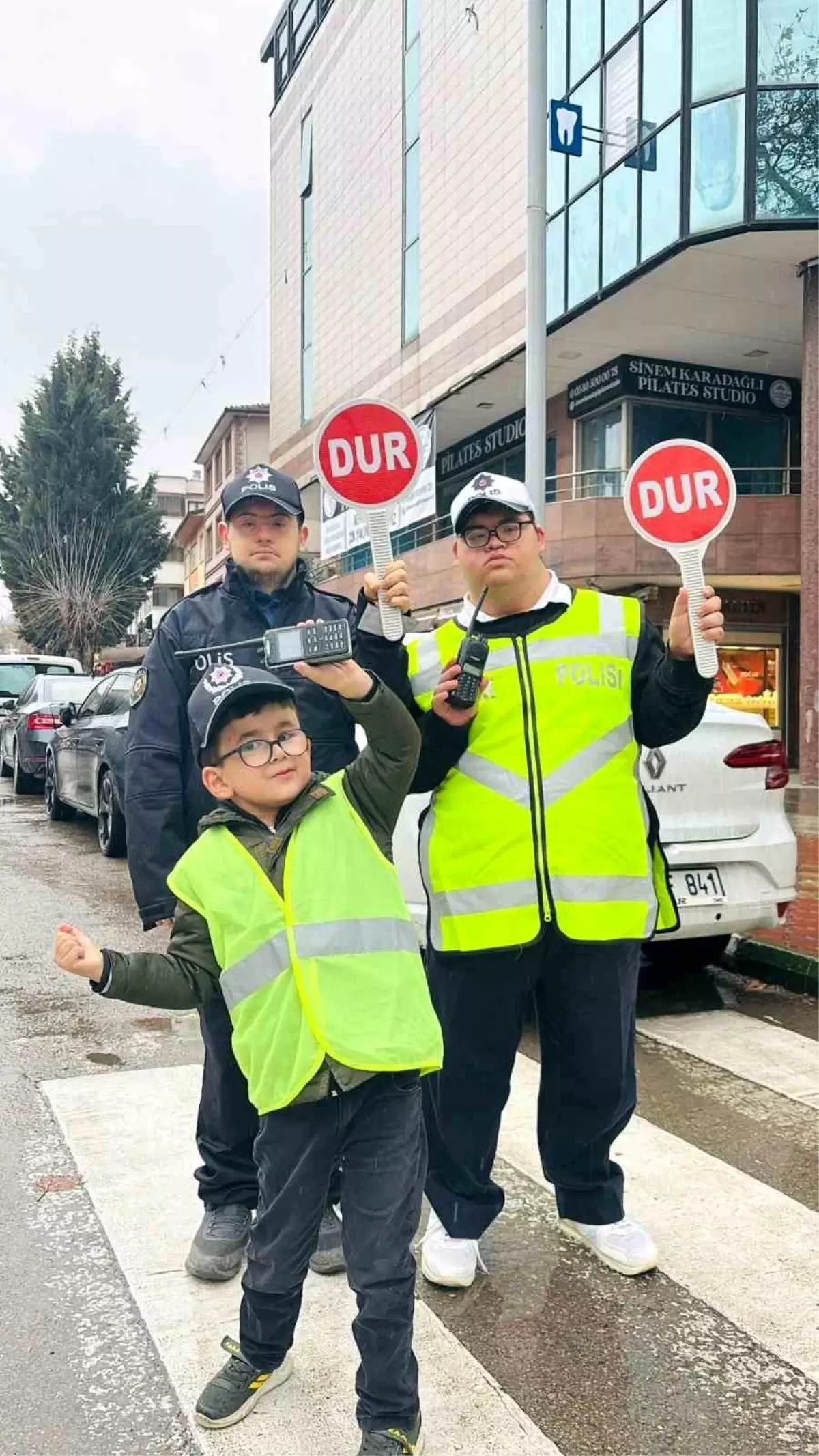 Polis elbisesi giydirilen çocuklar, trafik ekipleri ve görevliler gözetimindeki yaya geçidi uygulamasında sürücülere ve yayalara uyarılarda bulundu.