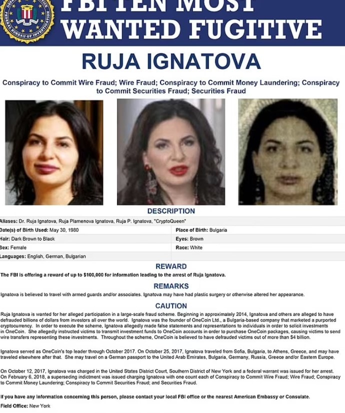 ABD’deki yetkililer, yaklaşık 175 ülkede OneCoin kripto para biriminin destekçilerinden 3,3 milyar sterlin değerinde yatırım alarak kaçtığına inandıkları için dolandırıcılıkla suçluyor. Ve yıllar geçmesine rağmen Ignatova’nın başına gelenler hakkında hâlâ pek bir şey bilinmiyor.
