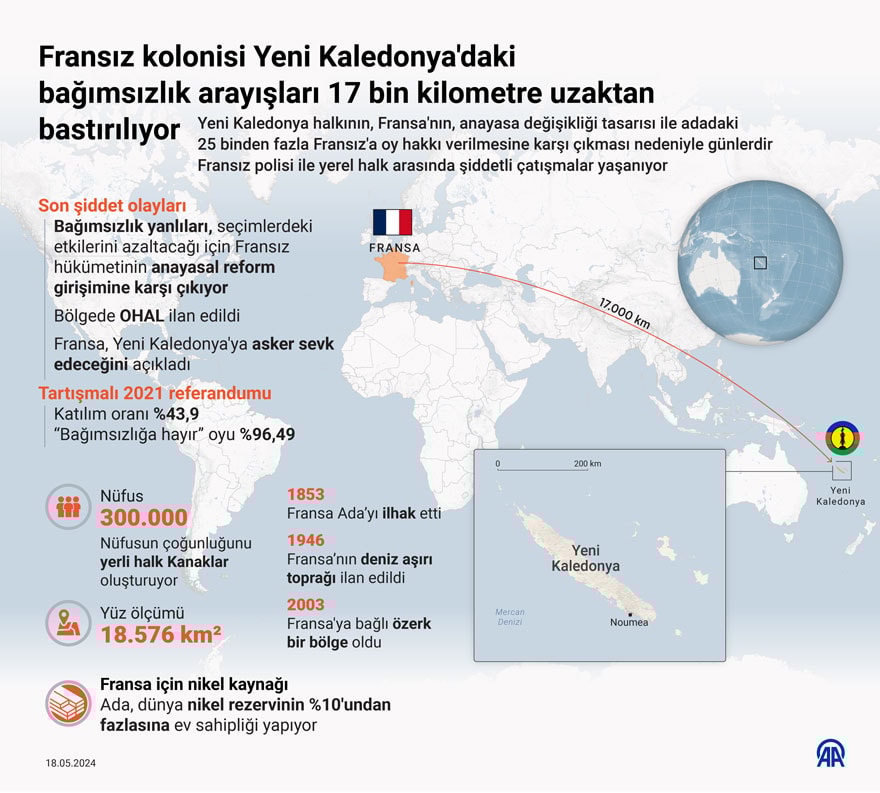 Fransız kolonisi olan Yeni Kaledonya’da yerel halkın Fransız vatandaşlarına oy hakkı verilmesine tepki olarak başlattığı olayları bastırmak için Fransa hükümeti harekete geçti.