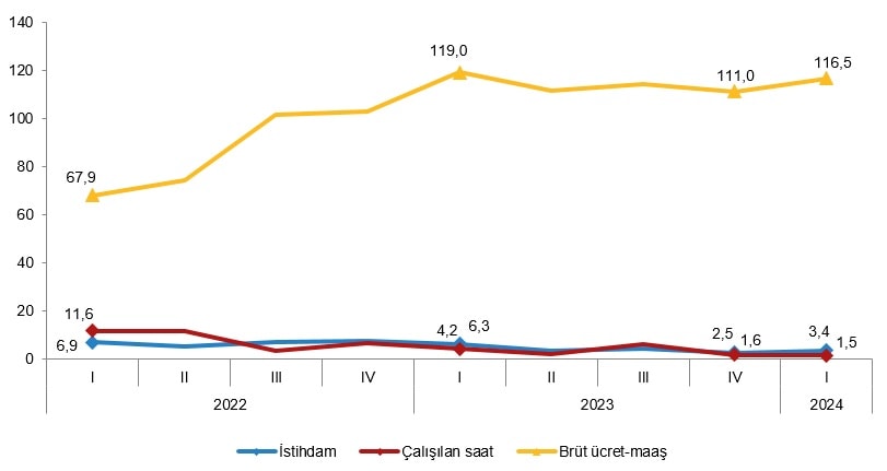 Sanayi, inşaat ve ticaret-hizmet sektörleri toplamında brüt ücret-maaş endeksi, 2024 yılı I. çeyreğinde bir önceki yılın aynı çeyreğine göre yüzde 116,5 arttı. Alt sektörler incelendiğinde, endeks; sanayi sektöründe yüzde 115,9, inşaat sektöründe yüzde 133,3 ve ticaret-hizmet sektörlerinde yüzde 114,8 arttı.