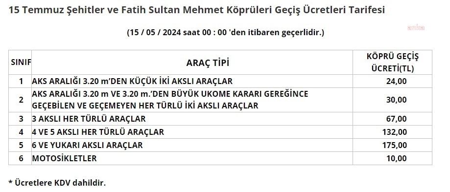 Karayolları Genel Müdürlüğü’nün (KGM), açıklamasına göre, 15 Temmuz Şehitler ve Fatih Sultan Mehmet köprüleri tek yön otomobil geçiş ücretine yüzde 60 zam yapılarak 15 liradan, 24 liraya, çıkarıldı. Aks aralığı 3.20 metre ve 3.20 metreden büyük araçlar ise 19 liradan 30 liraya, 3 akslı araçlar 42 liradan 67 liraya, 4 ve 5 akslı araçlar 83 liradan 132 liraya, 6 ve yukarı akslı araçlar 110 liradan 175 liraya çıkartıldı.
