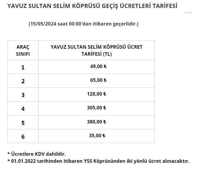 Yavuz Sultan Selim Köprüsü birinci sınıf araçlar için yüzde 40 zamlanarak 35 liradan 49 liraya yükseltilirken, ikinci sınıf araçlar 45 liradan 65 liraya, üçüncü sınıf araçlar için 85 liradan 120 liraya, dördüncü sınıf araçlar için 220 liradan 305 liraya, beşinci sınıf araçlar için 275 liradan 380 liraya, altıncı sınıf araçlar için 25 liradan 35 liraya yükseltildi.