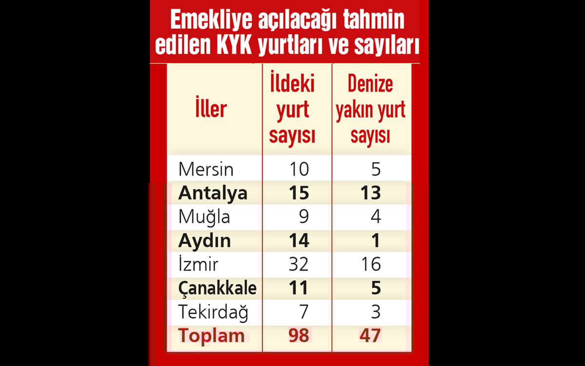 KYK’nın yönetiminde Ege, Akdeniz ve Marmara’daki 7 ilde toplam 98 adet yurdu bulunuyor. Ancak bunlardan sadece 47 tanesi denize yakın ya da bir taşıtla kısa sürede denize ulaşılabilecek mesafede bulunuyor. Bunların içinden emeklilere uygun olmayacaklar da çıkarıldığında sayı 40’ın da altına düşüyor. Dolayısıyla 100 emekliden sadece 1’i dahi KYK yurduna gitmek istese en az 160 bin yatak gerekiyor. Yurtlar talebi karşılamayacağı için tatili de torpilli emeklilerin yapabileceği ifade ediliyor.