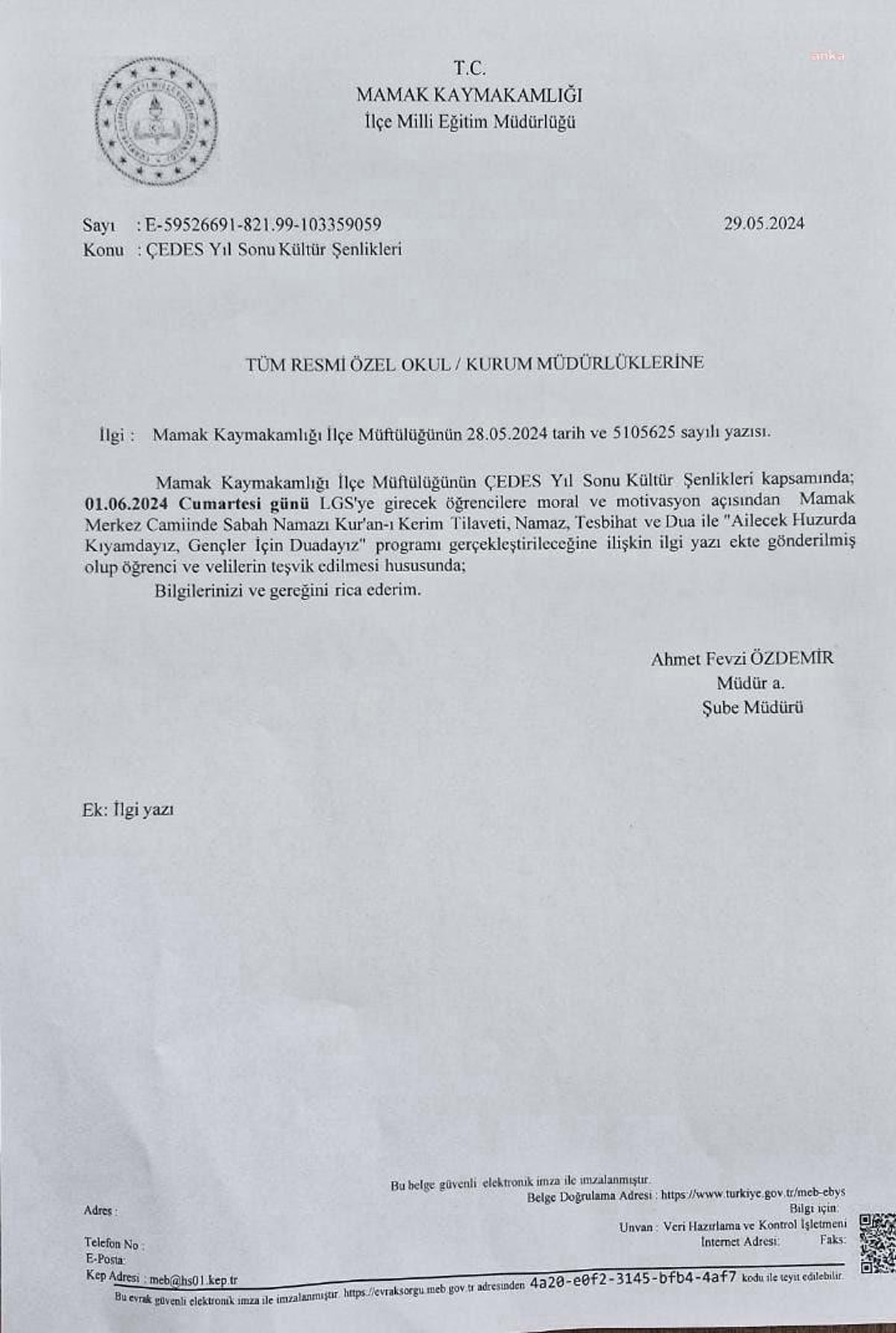 Tüm resmi ve özel okul müdürlüklerine, şube müdürü Ahmet Fevzi Özdemir imzasıyla yollanan yazıda “Mamak Kaymakamlığı İlçe Müftülüğü’nün ÇEDES yıl sonu kültür şenlikleri kapsamında 1 Haziran Cumartesi günü LGS’ye gidecek öğrencilere moral ve motivasyon açısından Mamak Merkez Camii’nde, sabah namazı, Kuranı Kerim Tilaveti, namaz, tesbihat ve dua ile ‘Ailecek Huzurda Kıyamdayız, Gençler İçin Duadayız’ programı gerçekleştirileceğine ilişkin ilgi yazı ekte gönderilmiş olup öğrenci ve velilerin teşvik edilmesi hususunda bilgilerinizi ve gereğini rica ederim” ifadelerine yer verildi.