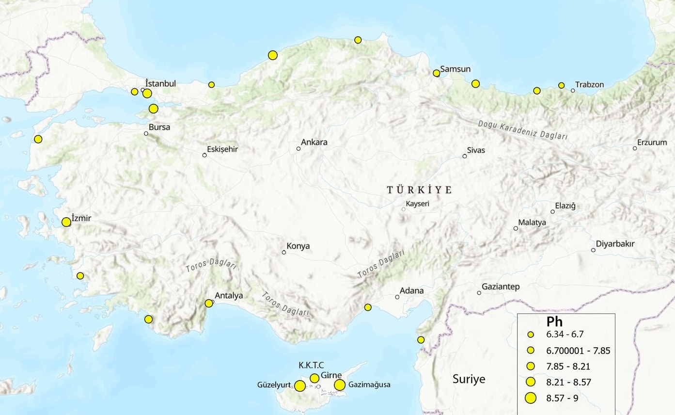 “İlk izlenim olarak Karadeniz ve Doğu Akdeniz’in, kıyılarımızda kirlilik ve biyolojik üretkenlikle paralel pH değerleri 8’in altında ölçüldü yani bu bölgelerde daha asidik bir durum gözlemlendi. Örneğin Mersin kıyılarında 7.7, Karadeniz 7.8, Marmara 7.9 civarı değerler olduğu görüldü. Görece daha temiz kıyılara sahip KKTC’de ise daha alkali (8.4 civarı) bir durum gözlemlendi.”