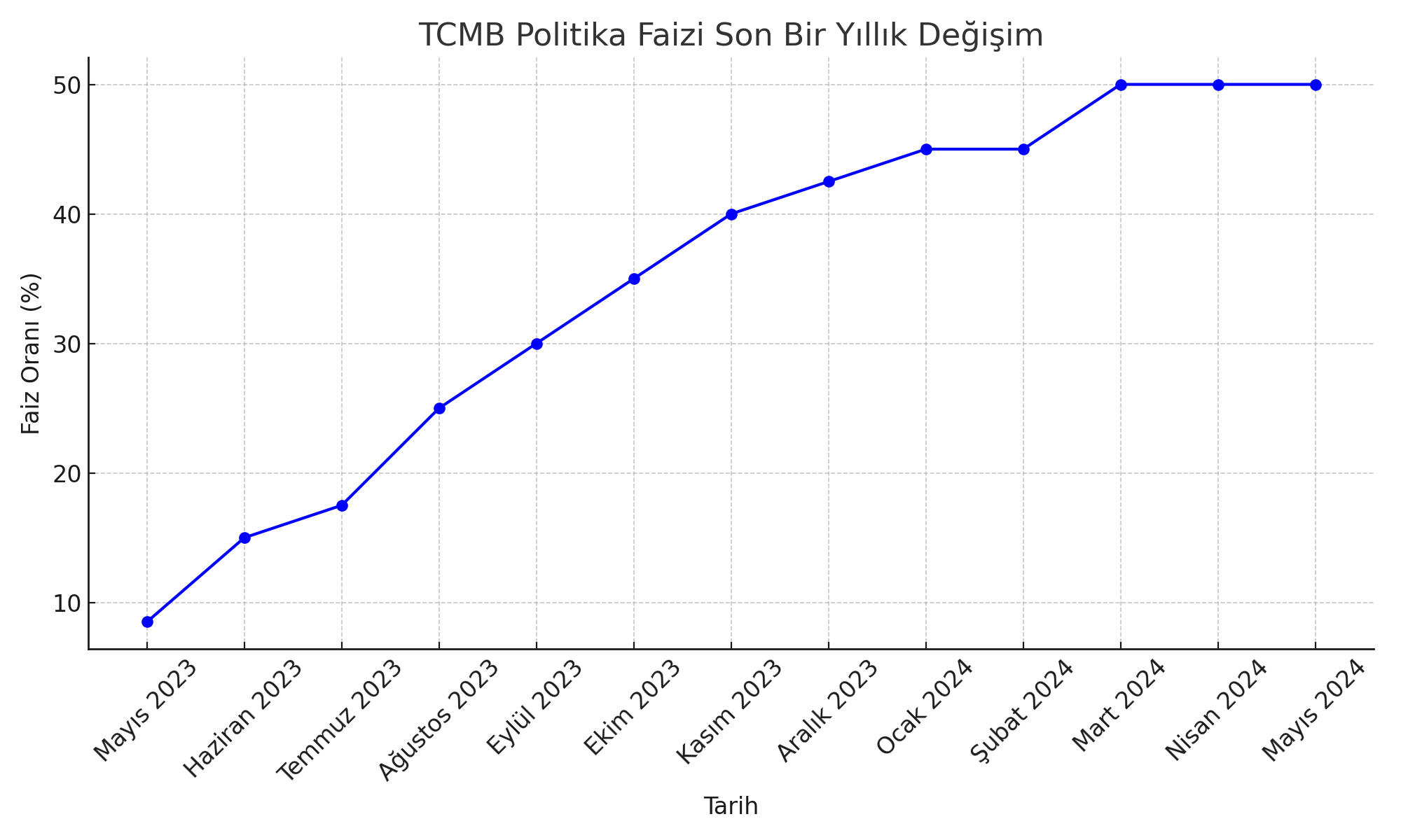 TCMB haziranda 650 baz puan, temmuzda 250 baz puan, ağustosta 750 baz puan, eylül, ekim ve kasımda 500’er baz puan, aralıkta 250 baz puan, ocakta 250 baz puan, martta 500 baz puan faiz artırarak faizleri son bir yılda 4 bin 150 baz puan yükseltti.