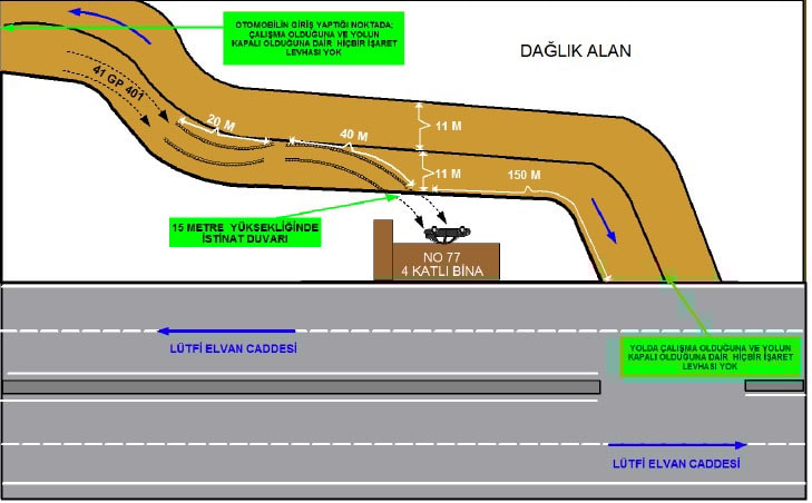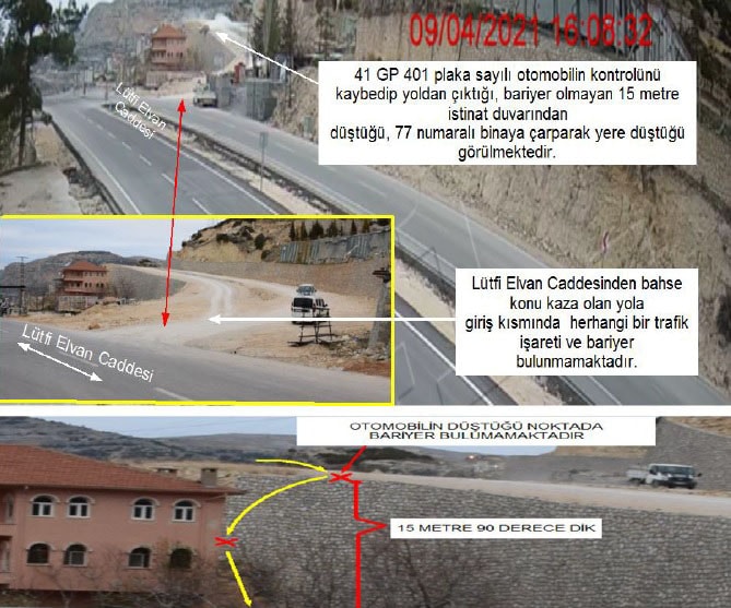 “Yola giriş yapan sürücü Seycan Alan sevk ve idaresindeki 41 GP 401 plaka sayılı otomobil ile kontrolünü kaybederek savrulup, korkuluk bulunmayan 15 metre yükseklikten yere düşerek ağır yaralanarak vefat ettiği kazanın oluşumunda; 2918 Sayılı Karayolları Trafik Kanunu, Karayolu trafik güvenliği 13’üncü maddesine göre, kara yolunun yapımı, bakımı, işletilmesi ile görevli ve sorumlu bütün kuruluşlar, kara yolu yapısını, trafik güvenliğini sağlayacak durumda bulundurmakla yükümlüdür.
