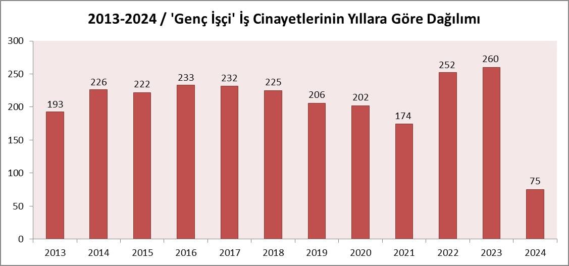 2013 yılında en az 193 genç işçi, 2014 yılında en az 226 genç işçi, 2015 yılında en az 222 genç işçi, 2016 yılında en az 233 genç işçi, 2017 yılında en az 232 genç işçi, 2018 yılında en az 225 genç işçi, 2019 yılında en az 206 genç işçi, 2020 yılında en az 202 genç işçi, 2021 yılında en az 174 genç işçi, 2022 yılında en az 252 genç işçi, 2023 yılında en az 260 genç işçi ve 2024 yılının ilk dört ayında en az 75 genç işçi olmak üzere; 2013-2024 yılları döneminde “en az” 2500 genç işçi hayatını kaybetti.