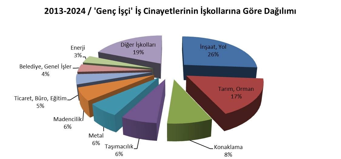 2013-2024 yılları döneminde genç işçi iş cinayetlerinin işkollarına göre dağılımı ise şöyle oldu: