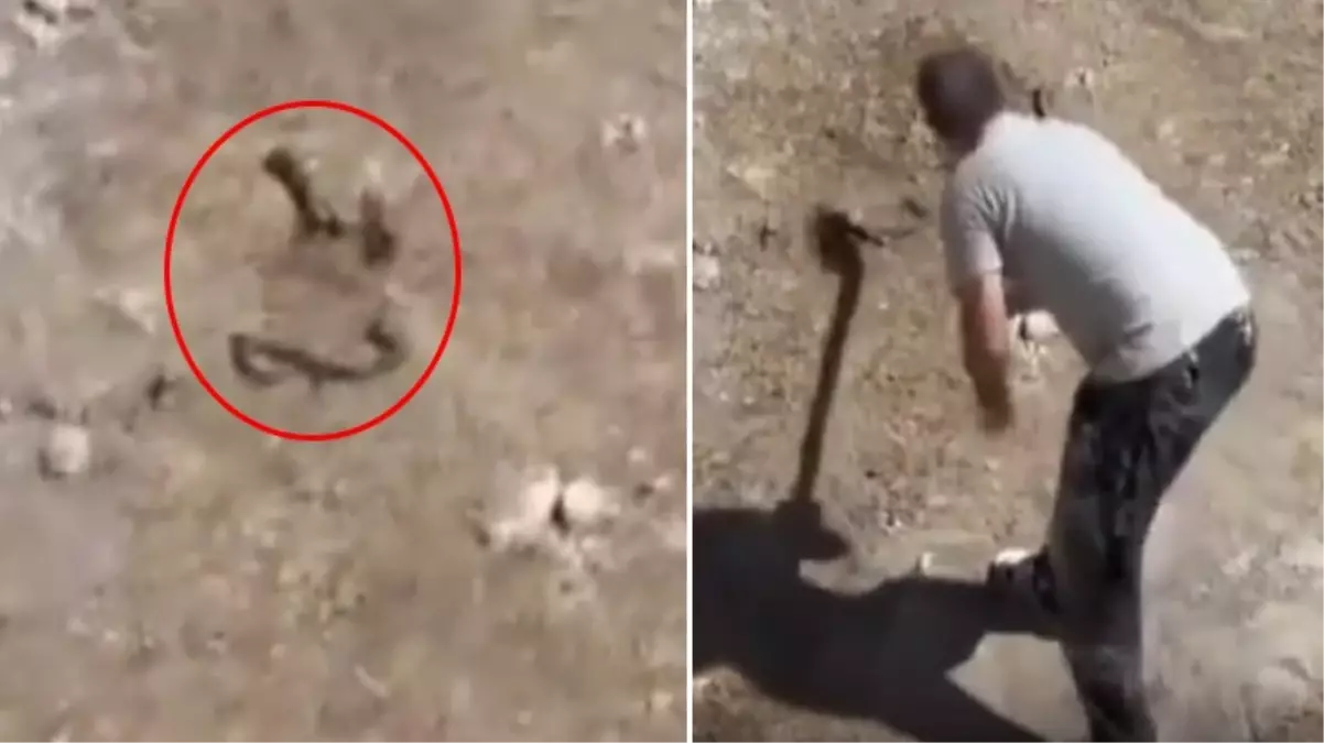 İşçiler tarafından kürekle telef edilen yılanın kafa kısmı kaçmaya devam etti