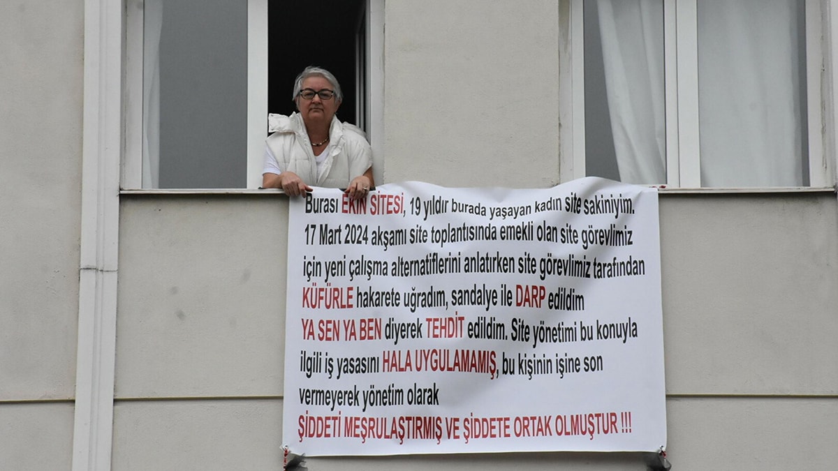 Öte yandan sesini duyurmak isteyen Aysun Bodur, oturduğu daireye 'Burası, Ekin Sitesi. 19 yıldır burada yaşayan kadın site sakiniyim. 17 Mart 2024 akşamı site toplantısında emekli olan site görevlimiz için yeni çalışma alternatiflerini anlatırken, site görevlimiz tarafından küfürle hakarete uğradım, sandalye ile darbedildim. 'Ya sen ya ben' diyerek tehdit edildim. Site yönetimi, bu konuyla ilgili İş Yasası'nı halen uygulamamış. Site yönetimi, bu kişinin işine son vermeyerek şiddeti meşrulaştırmış, ortak olmuştur' yazılı pankart astı. Aysun Bodur, şu ifadeleri kullandı;