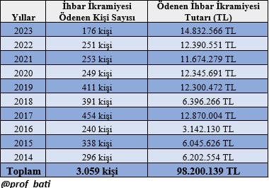 1905 sayılı Kanun uyarınca 2023 yılında ihbarda bulunan 176 kişiye ödenmek üzere toplam 14 milyon 832 bin 566 lira ihbar ikramiyesi ödendi. Son 10 yılda ise 3 bin 59 kişiye yaklaşık 98 milyon lira ihbar ikramiyesi ödendi.