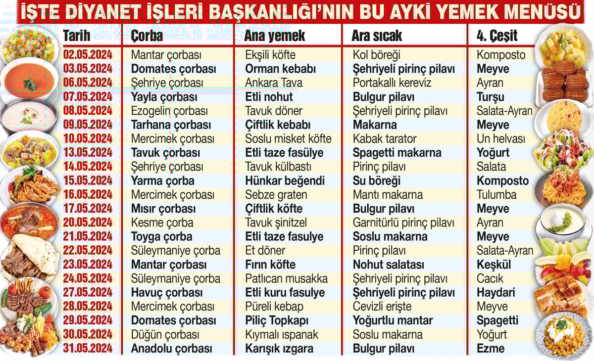 Milyarlarca liralık bütçesi ve lüks makam araçlarıyla gündemden düşmeyen Diyanet İşleri Başkanlığı’nın (DİB) üst düzey yöneticileri için hazırlanan öğle yemeği listesi ortaya çıktı. Vatandaşın ucuz et için zifiri karanlıkta kuyruklara girip saatlerce kuyruk beklediği, çocukların ete ulaşamadığı bir ülkede DİB’in üst düzey yöneticileri için hemen her gün etli yemek çıkıyor. Sebze yemekleri de kıymalı yapılıyor. Diyanet’in 17 Mayıs, yani bugünkü sofrasında “mısır çorbası, çiftlik köfte, bulgur pilavı, meyve” olacak.