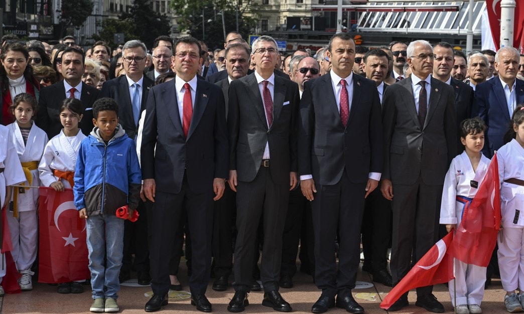 Kılıçarslan ile Özbay’ın alandan ayrılmasının ardından düzenlenen yeni törende İBB Başkanı Ekrem İmamoğlu, zabıta mangası eşliğinde Taksim Cumhuriyet Anıtı’na belediye çelengi bıraktı.